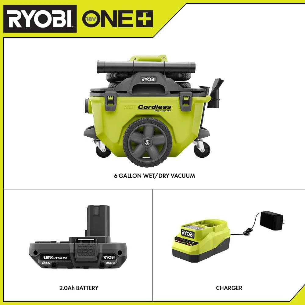 RYOBI introduces the 18V ONE+ Cordless 6 Gal. Wet/Dry Vacuum with Hose, Crevice Tool, Floor Nozzle, Extension Wand, 2.0 Ah Battery, and Charger. Now, you can experience the corded performance with cordless convenience. This vacuum has a powerful 80 CFM. The multi-size no-tip wheel design and 360° mobility keeps your vacuum balanced when rolling over cords and thresholds. On-board accessory storage conveniently holds your crevice tool, floor nozzle and extension wands, while the hose dock provides a simple solution to storing your hose when not in use. Multiple carrying handles allow for easy carrying and the removable top makes emptying dust, debris and liquids quick and mess-free. The compact design allows for space-saving storage when not in use. The included 2.0 Ah Battery and 18V Charger are compatible with all RYOBI 18V ONE+ Tools. Best of all, it’s a part of the RYOBI 18V ONE+ System of over 260 cordless tools that all work on the same battery platform. Backed by the RYOBI 3-Year Manufacturer’s Warranty, this 18V ONE+ Cordless 6 Gal. Wet/Dry Vacuum includes a 7 ft. x 1-7/8 in. hose, a crevice tool, a floor nozzle, a cartridge style filter, two extension wands, a 2.0 Ah Battery, an 18V Charger, and operator’s manuals.