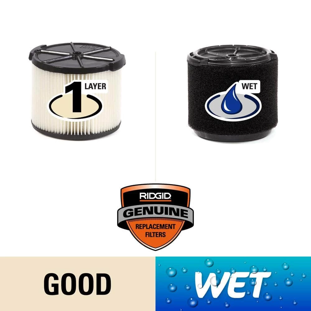 - Includes 1 RIDGID 1-Layer Standard Dry Filter (VF3400) and 1 RIDGID Wet Application Filter (VF3700) for shop vacs to help trap particles that could harm the motor and decrease performance