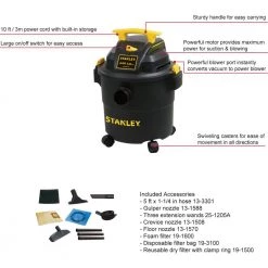 The Stanley 5 Gal. wet/dry vac features a powerful heavy-duty motor for industry leading performance, providing maximum suction power for heavy-duty pickup. Great for drywall dust, fine filtration, washable, reusable, use for both wet and dry pickups. Powerful blower port instantly converts vacuum to power blower. Strong handle for easy carrying. Large on/off switch with water-resistant design for safe and quick access. Convenient, built-in power cord wrap. Accessory storage casters keep your tools organized and provide ease of movement in any direction. Built-in tank drain makes draining easy. Stanley wet/dry vacuums provide superior performance in any environment. From a portable wall-mounted 1 Gal. 1.5 Peak HP vacuum great for a variety of clean-up tasks in any room at home and the garage to the rugged 14 Gal. 6.5 Peak HP Stainless Steel vacuum for heavy-duty use, Stanley vacuums make short work of even the toughest jobs, saving you time and effort. Includes a 1-year limited warranty. Extended warranties available.